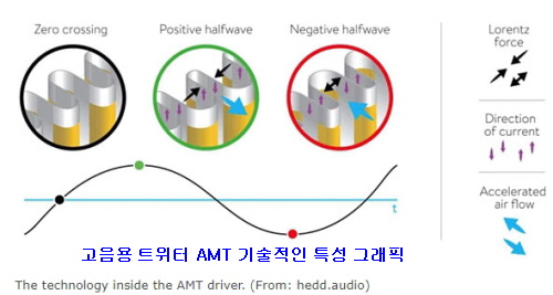 (The Air Motion Transformer is an electromagnetic driver, as it is based on the Lorentz force that moves the air in the single folds. The diaphragm itself has an aluminum circuit printed on it(violet arrows) and is surrounded by a strong magnetic field.